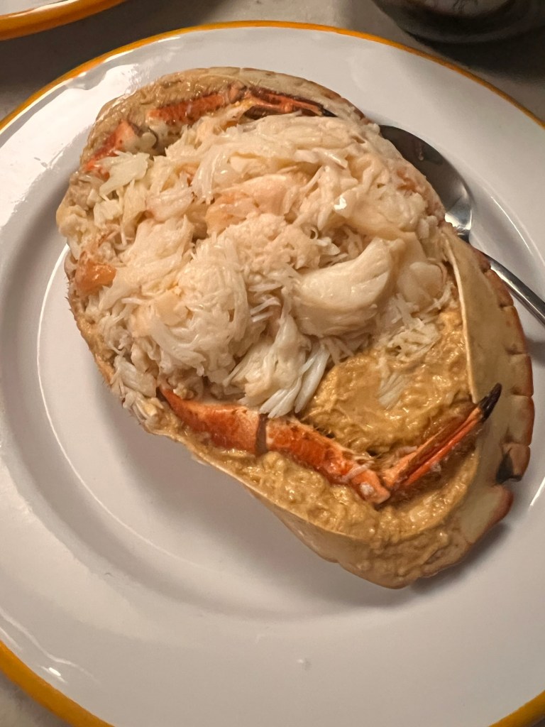 We had the dressed crab served with salad and homemade bread (care of the hubbys secret no-knead recipe). If I can winkle it out of him, I will share it here.