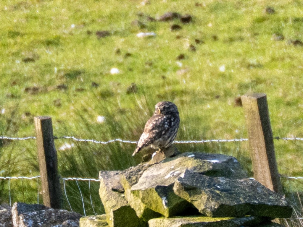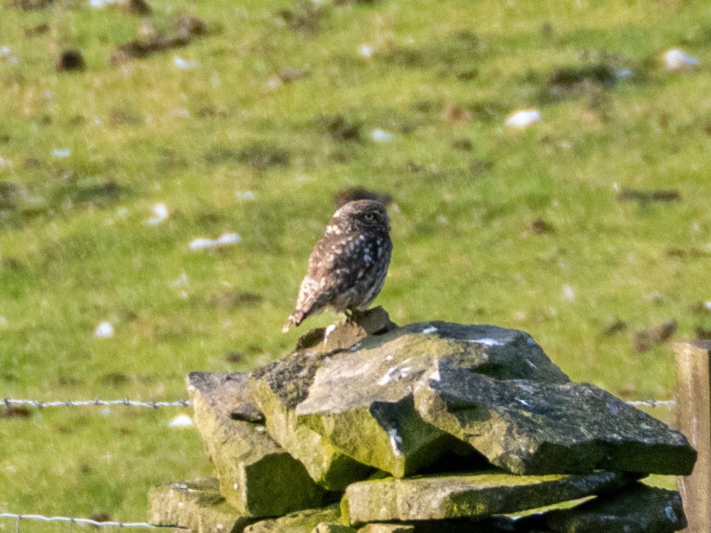 On Tuesday, I spied a little owl. These are quite common around Helmshore, but hide well on drystone walls, so I usually only see them when they suddenly take off. I spotted this one from a distance out in the open, so was able to take a few pictures; I didn’t have my long lens, but the 75-300 performed reasonably well over the long distance.