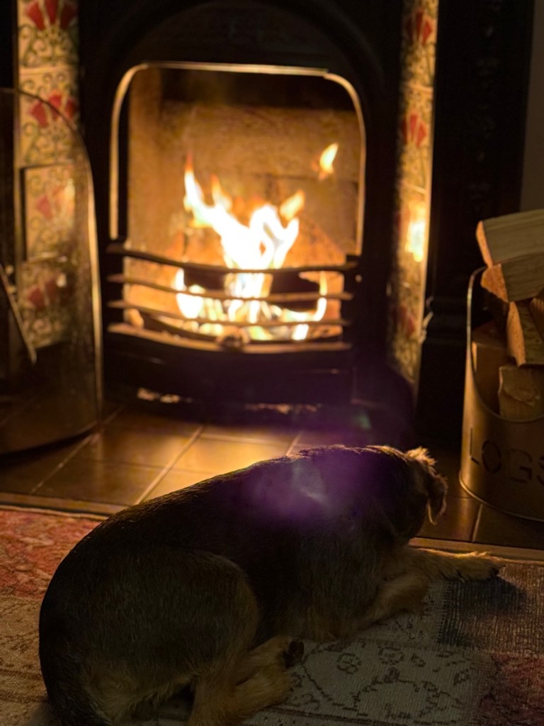 Still, we made it home eventually, collecting a very happy Pepper from her spa weekend at Nanna’s. We rounded off the trip exactly as it should end — in front of a roaring fire 🔥, a glass of wine in hand, and one contented little dog curled at our feet.