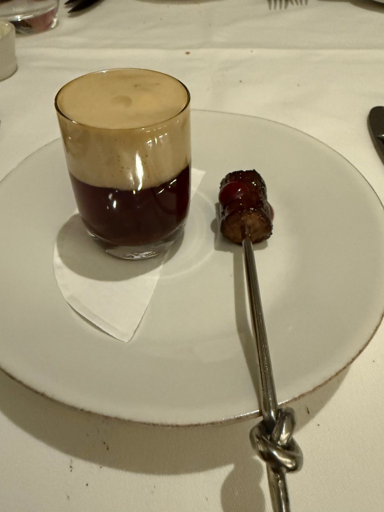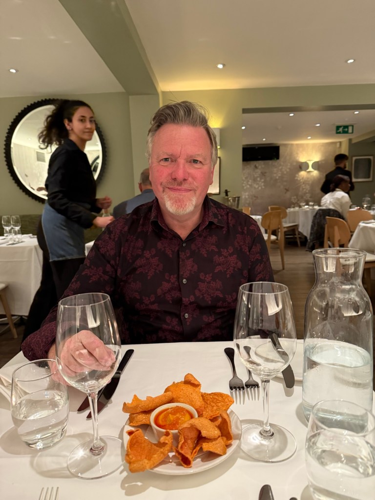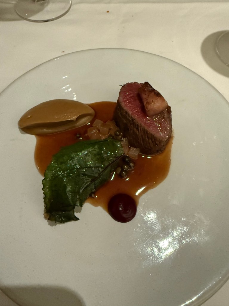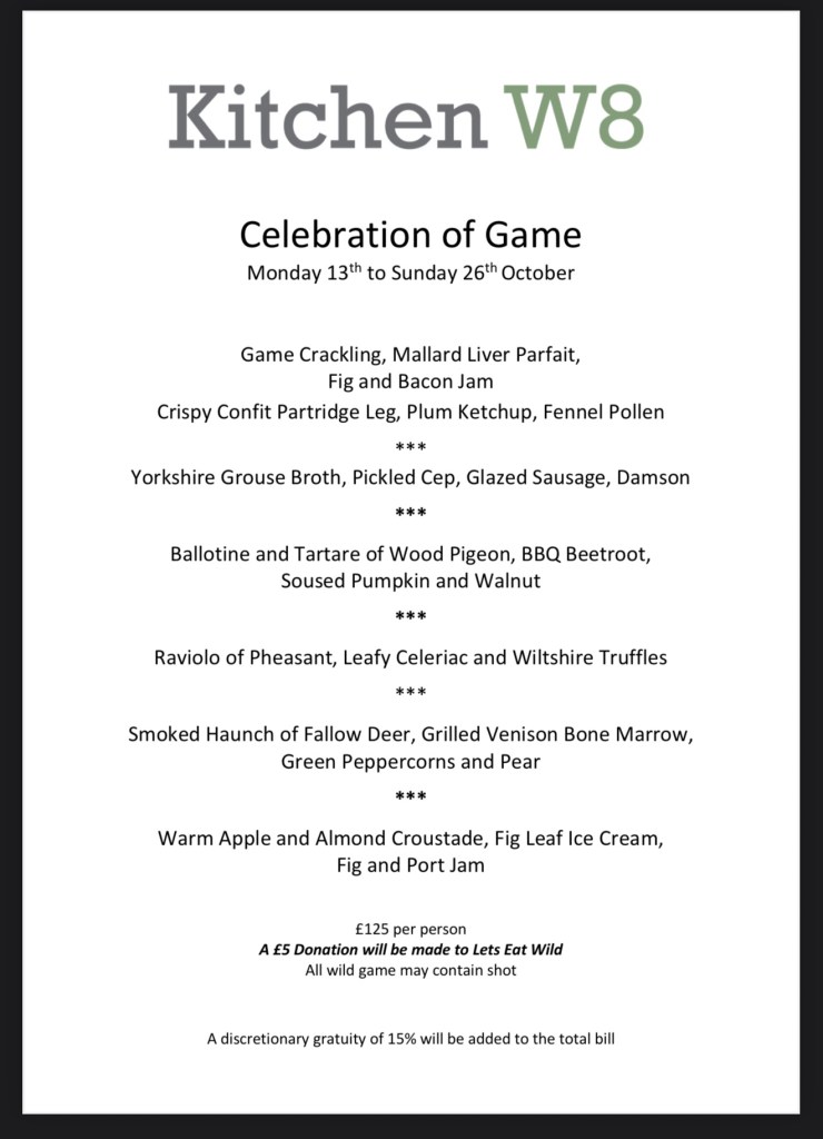 A quick Underground hop returned us to Kensington, to change then out again to where dinner awaited; Kitchen W8. We’d pre-booked the Game Tasting Menu with the accompanying wine flight.
