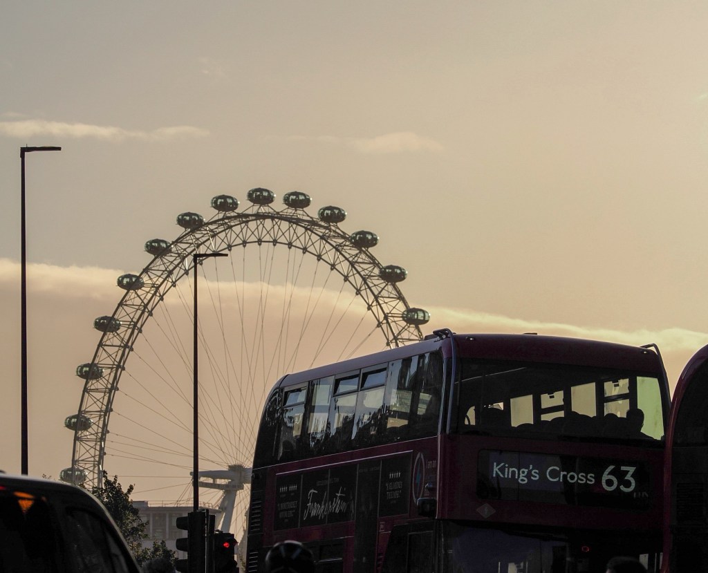 And there, right on cue, came the final flourish — a red London bus gliding across the bridge. I stopped to take the photo: the Eye haloed in gold, the bus bold and bright in the foreground. It’s the sort of image that feels almost staged, but London has a way of offering you its clichés in the most perfect light.