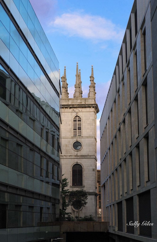 We left the Thames path here, anxious not to miss the opportunity to view the famous Cathedral. As we climbed the steps towards the cathedral, we passed the Royal College of Arms, its heraldic shields bright against the stone, and a beautiful white chapel tucked discreetly between two modern glass offices — not the Whitechapel of darker legend, but a quiet, elegant survivor of an older London.