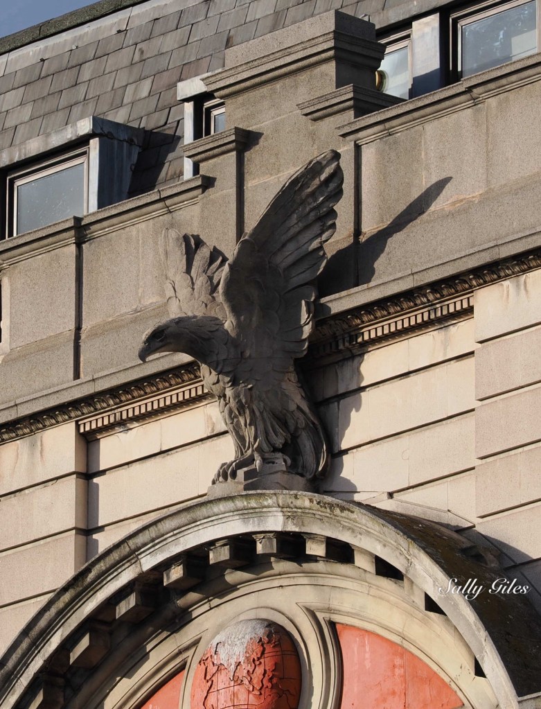 Leaving the Tower behind, we followed the curve of the river, where the evening light caught the carvings high on the old buildings — stone flourishes half-forgotten above modern shopfronts. One in particular caught my eye: an eagle, wings spread wide as though still guarding the city below.