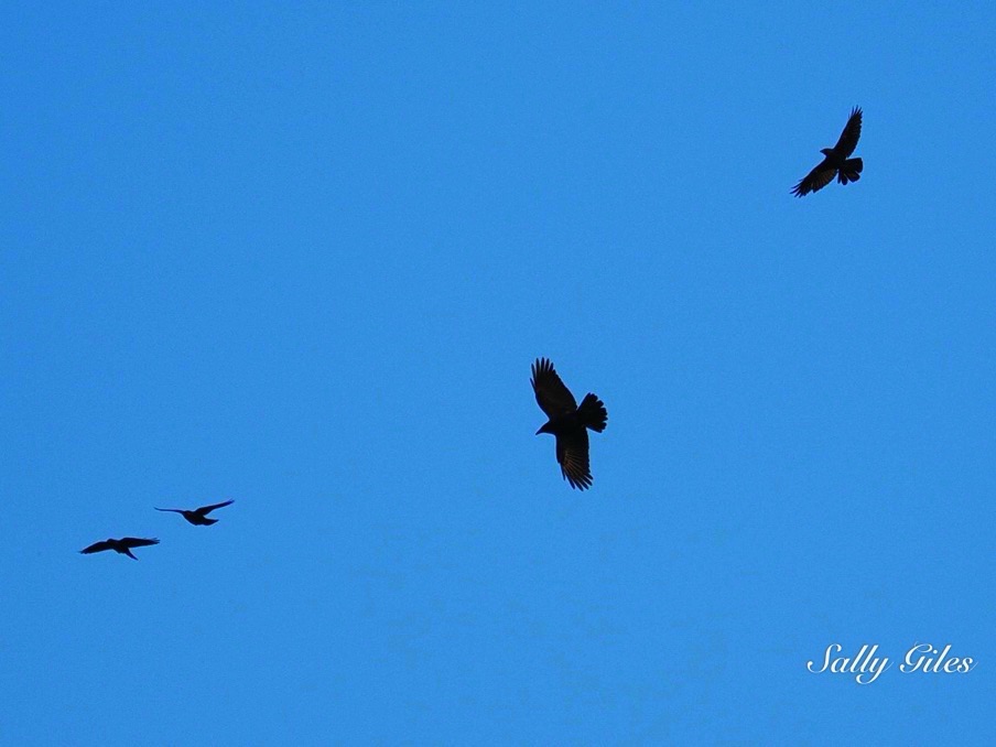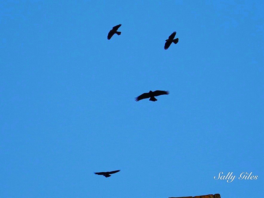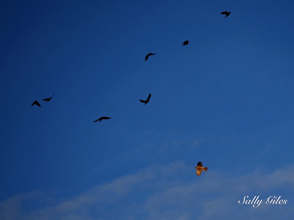 A movement caught my eye — a sparrowhawk wheeling against the pale blue sky, harried by a band of crows. I watched, spellbound, as it twisted and climbed, sunlight catching its chest while the crows turned dark against the light.
