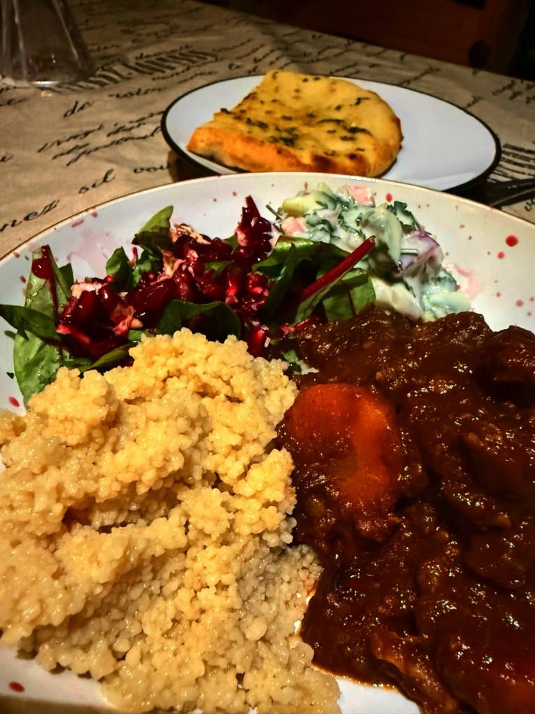 Lamb leg caught my eye, and I settled on making a lamb tagine — hardly traditional Welsh fare, but I prepared it at lunchtime, and had the whole afternoon to let it work its magic and, pleasingly, there were no casserole-dish disasters this time. The house slowly filled with the scent of warming spices. By evening, the tagine was rich, comforting and deliciously fragrant, served with fluffy couscous and a bright radish and pomegranate salad, with yoghurt dressing. A small Monday night indulgence. Pepper was equally content with her own lamb casserole, though hers quite sensibly omitted the spices.